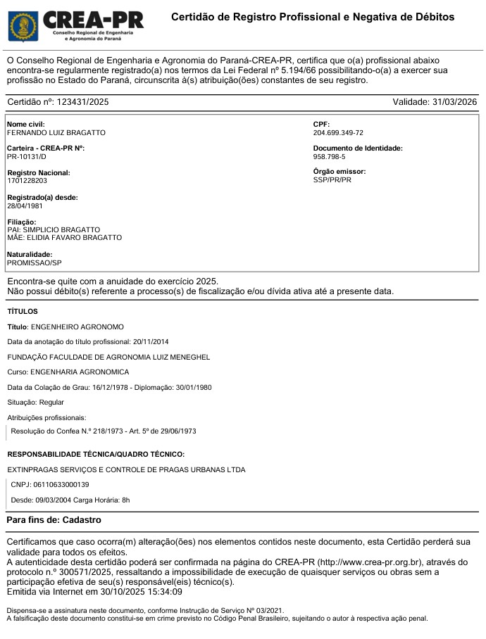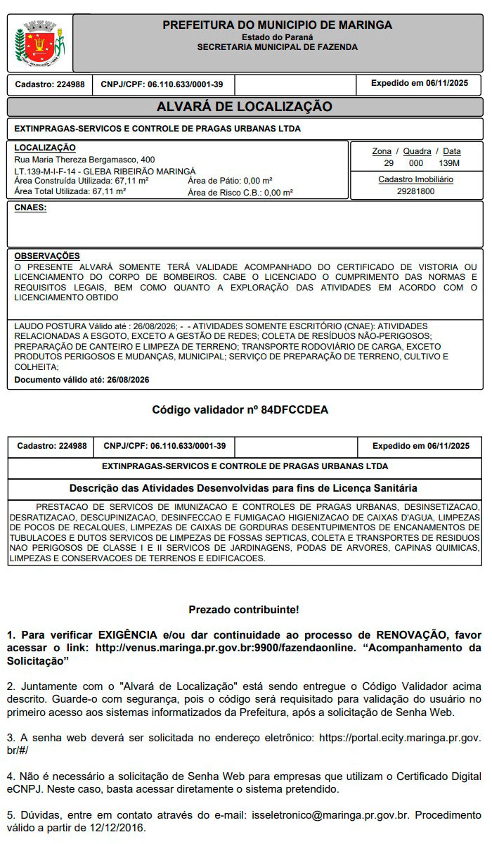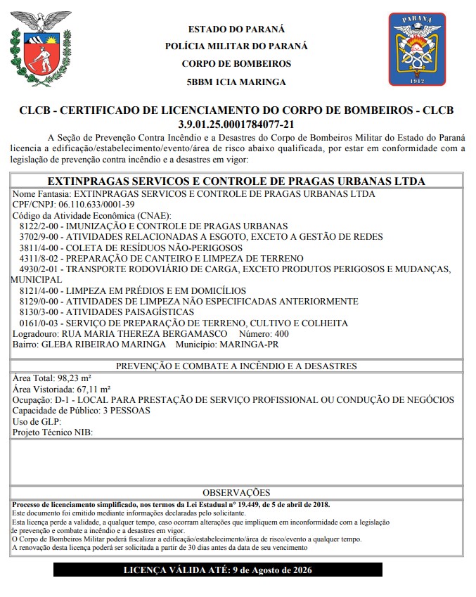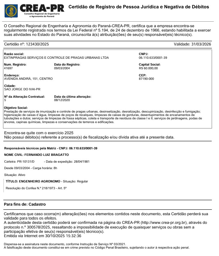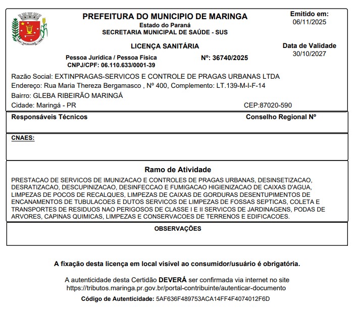 A Extinpragas atua com total responsabilidade e dentro das normas legais, oferecendo serviços com qualidade e segurança. Contamos com todas as certificações exigidas para operação, o que reforça nosso compromisso com a excelência e a confiança dos nossos clientes.